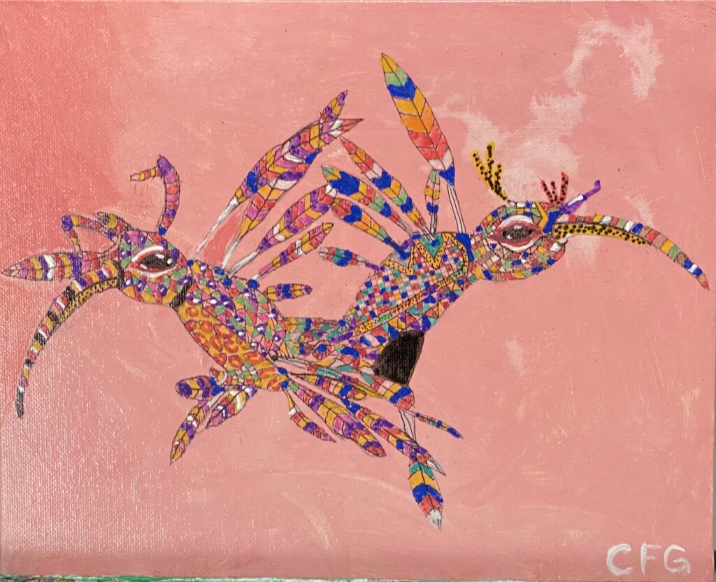 This piece is a combination of acrylic paint and colored sharpie pens. This painting was inspired by a photo I took in Chicago on the Riverwalk outside CocoBar of Mexican Folk Art. See the inspiration at this link.