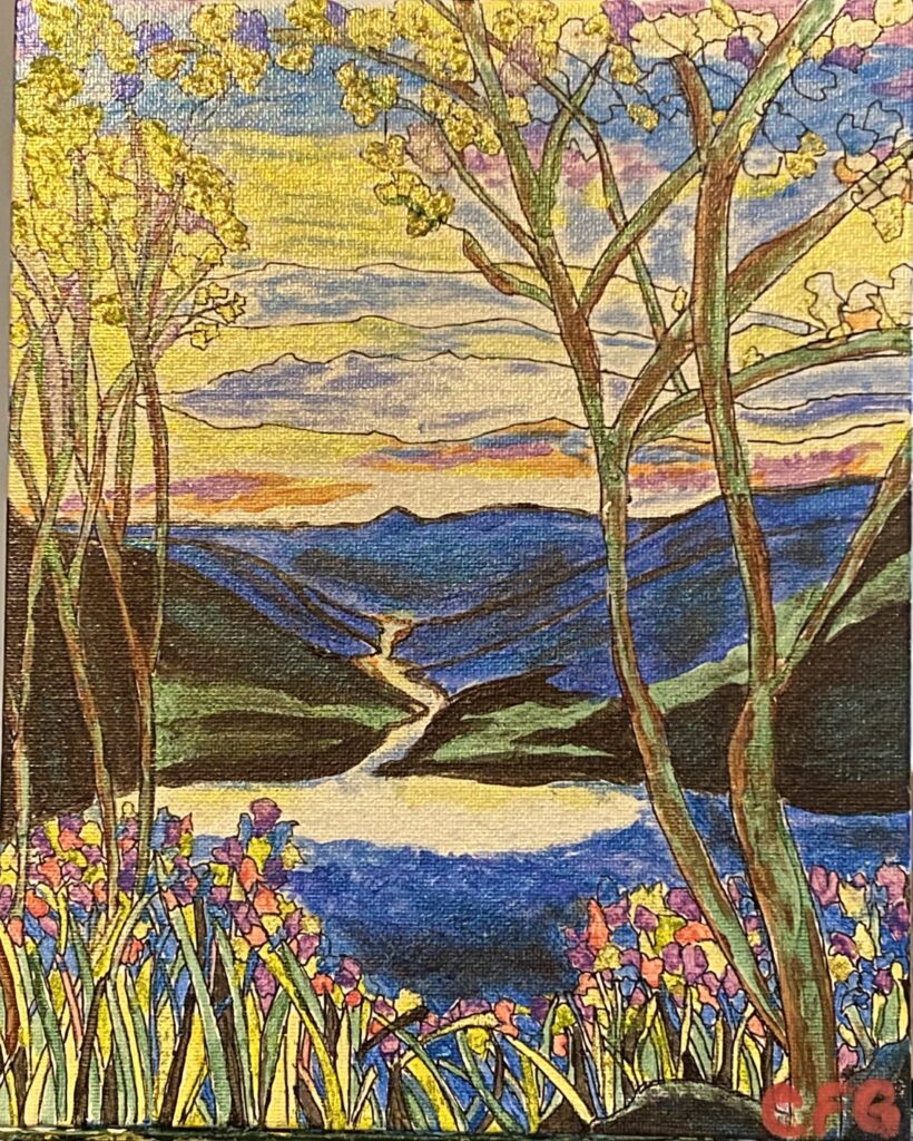 This acrylic landscape painting was inspired by a recent book I read by Michael Crichton and James Patterson, called Eruption. Notice the dragon that spawned from the eruption. The stone wall at the bottom I saw being constructed by the owner of a ranch I visited during a 2024 trip to Sicily with my son. See the original stone wall and book cover on my Process page at this link.