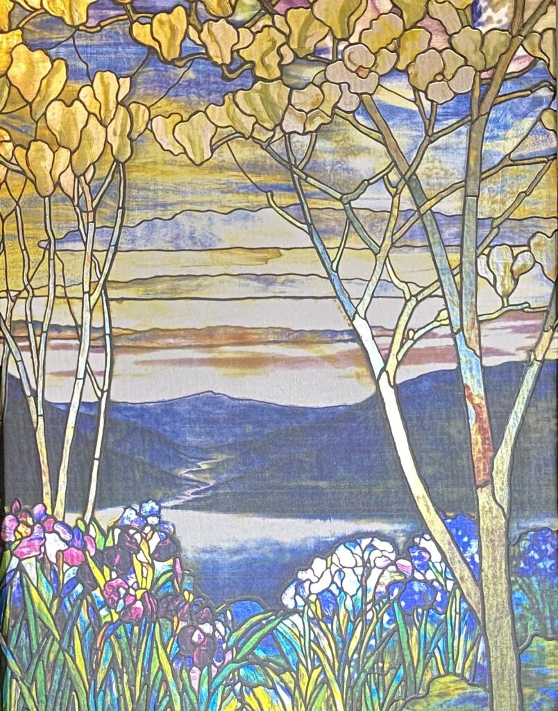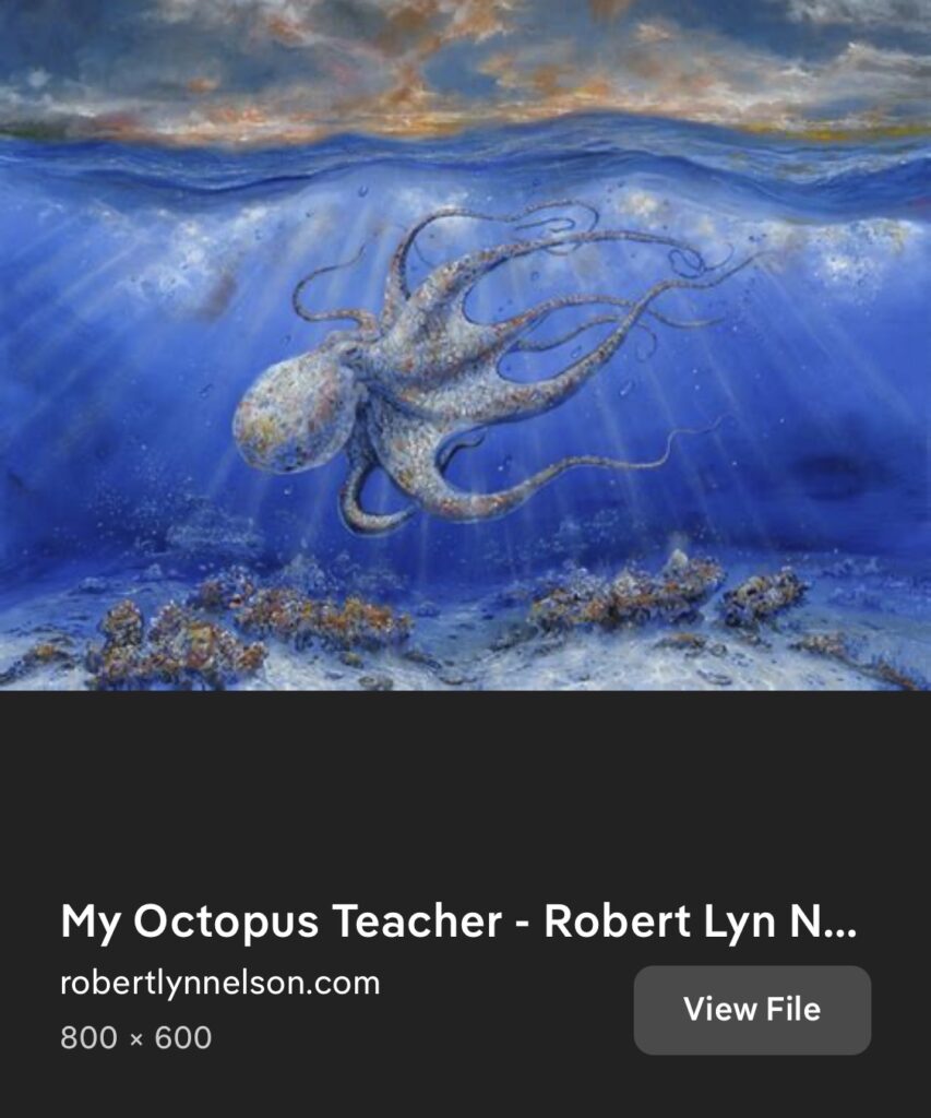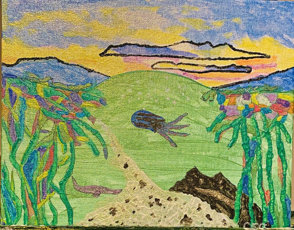 The octopus from My Octopus Teacher and the cover of my wife’s journal inspired this acrylic painting. I used iridescent colors for this painting. I combined my interpretation of the underwater picture with the landscape image, which I transformed to seaweed. My Octopus Teacher documents a year spent by filmmaker Craig Foster forging a relationship with a wild common octopus in a South African kelp forest.